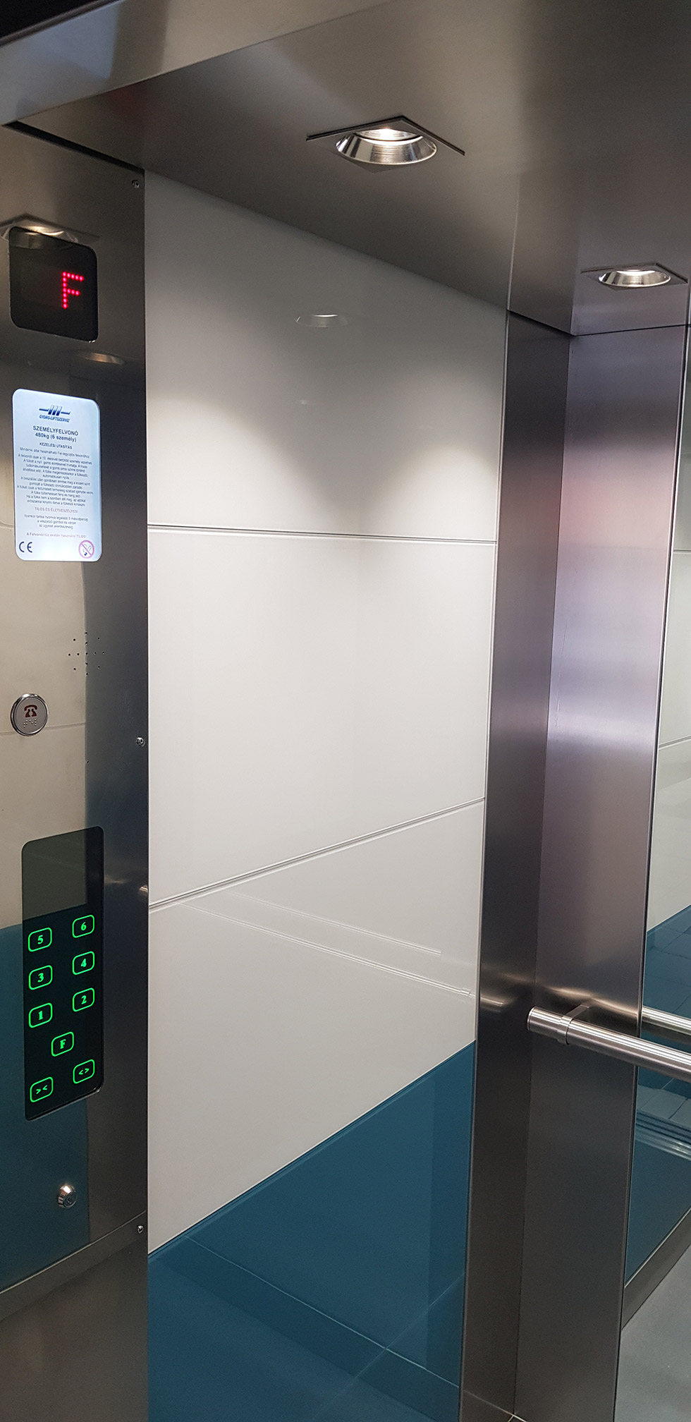 Harmadik ütem: felvonó fülke burkolása egyedi tervezés alapján, üveg burkolattal, süllyesztett világítással.